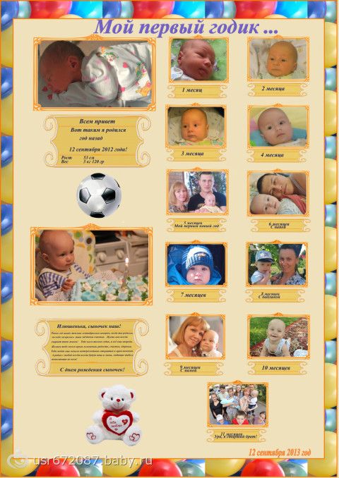 В фотошопе. Достаточно легко) Ищите фотографии которые вам нравятся от 0 и до года немного редактируете их редакторе. Коллаж состоит из 2 частей. 1 часть с поздравление, рождение и год. Вторая часть это фотографии и 1 месяца и до 11 месяцев. Соответственно делаете фон на котором вы хотите видеть ваш коллаж, рамки, в общем то и все. Каждую часть сохраняете в качестве фотографии, после создаете новый файл и вставляете эти две фотографии и оформляете тоже рамкой. Формат я делала А2.