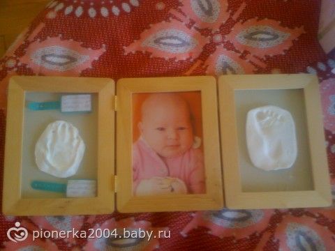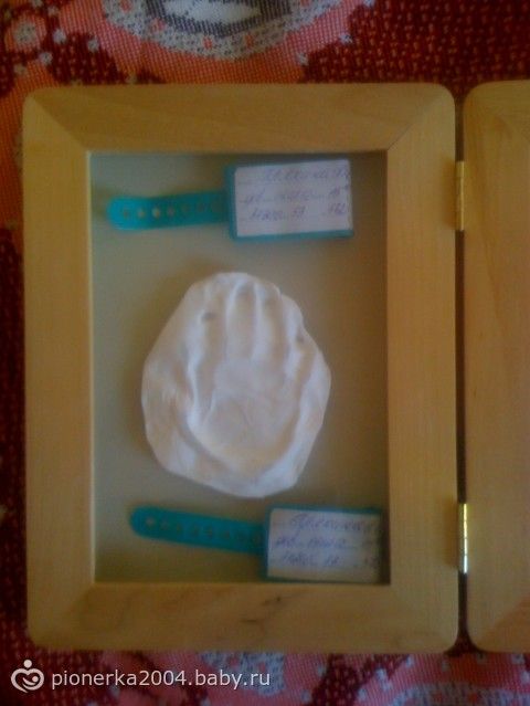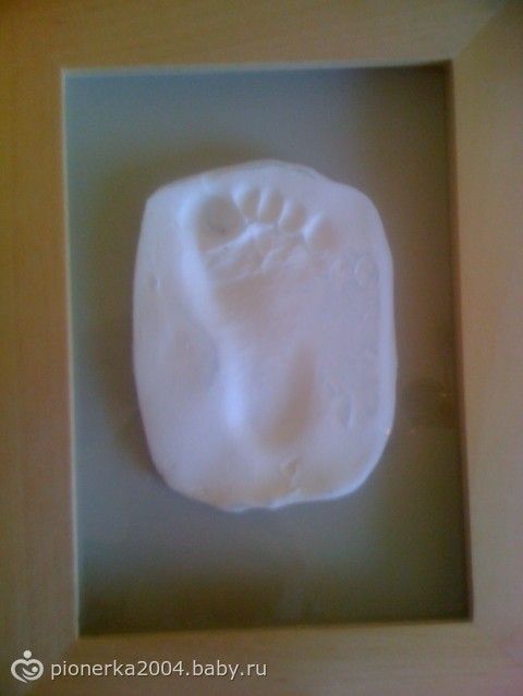 Делали ровно в месяц. Покупала в наборе с рамкой. Ничего не месили, только пласт раскатали и все!я думаю купить такие и пока спит сделать, и ручку и ножку, потом вырезать аккуратно, краской золотой покрыть и в рамку) надеюсь получится!