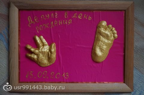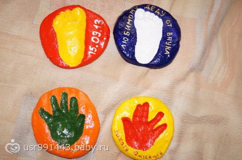 Соленое тесто раскатывала толщиной 2-3 см, чем толще тем лучше, потом делала отпечатки ручек и ножек, далее в духовку на слабый огонь и пока не закаменеет(час 3-4), затем отпечатки смазывала подсолнечным маслом и заливала гипсом(покупала набор для изготовления магнитов 90 р. в азбуке), оставляешь на ночь… Утром аккуратно вынимаешь слепочки из отпечатков и ножом срезаешь края, потом как работает твоя фантазия, я красила акриловыми красками, гуашью и покрывала прозрачным лаком.А отпечатки нужно будет еще подсушить, они от масла мягкие становятся, еще я забыла дырочки сделать, чтобы на стену повесить