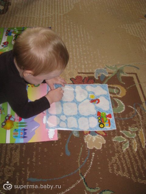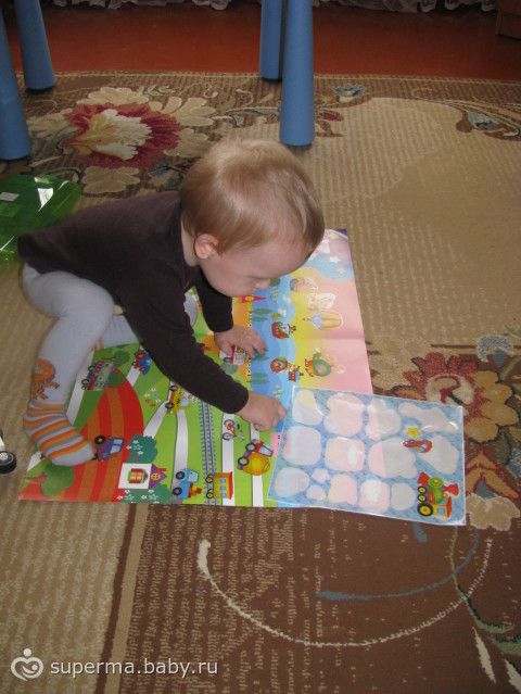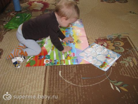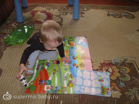аааа… не, я слежу чтобы не наклеивал не на плакат. Обнажды вытряживала всех персонажей «репки» из коляски. Теперь поиграл, сложилии и убрала