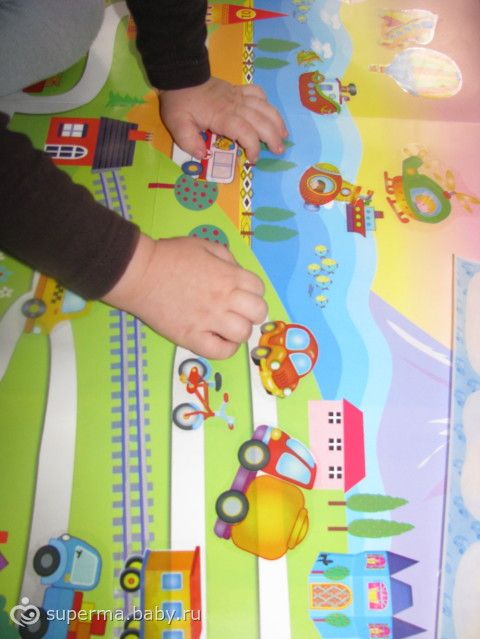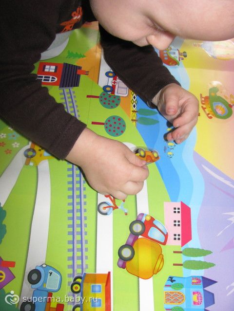 Ну вот дошли руки рассказать о многоразовых наклейках. Печатаю. В общем это такой плакат, его можно приклеить к стене, но так как периметр всех комнат в моей квартире уже занят чем то, приходится играть на полу, а может оно и к лучшему, потому как отрывая наклейки для переклеивания плакат может порваться в местах крепления. С плакатом идет две страницы с машинками 30 шт. Плакат называется «Едим, плывем, летим» 145 руб… Играем просто, наклеиваем куда надо, а потом куда не надо… устраиваем аварии на дороге (наклейки внахлест) с вызовом скорой помощи (тоже наклейка). Ооочень не хватает фигурок людей. Но я ж помешанная на пособиях, у нас есть и люди, с Репки, то бабушка на дороге встанет, и не дает машине проехать, то кот на дерево прилипнет и едет в нему пожарная машина. А ещё деть пытается наклеить наклейки обратно в нужные ячейки (сказываются игры во вкладыши деревянные). Наклеек у нас валом, буду попозже показывать ещё.