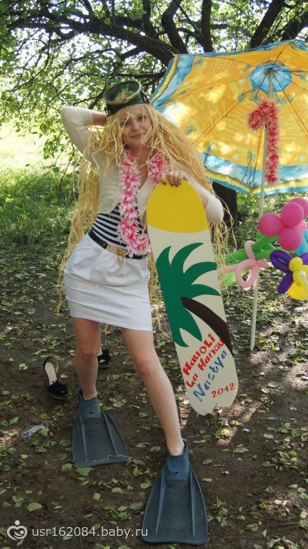Понадобится инвентарь: очки для ныряния, гавайская юбка, для женщин лифчик из цветов, ласты, доска для серфинга или некое ее подобие и фотоаппарат. Набор данного инвентаря может быть в одном экземпляре – в этом случае участники будут участвовать по очереди, а ведущий будет засекать время. (у нас так было) Если есть возможность, можно подготовить 2-3 набора инвентаря, и тогда 2-3 участники соревнуются одновременно, а выигрывает тот, кто опередит соперников.