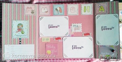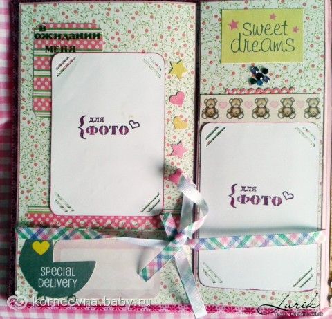 Первая страничка «В ожидании меня + я родилась» — многослойная. Она перевязана ленточкой и в закрытом варианте выглядит так:
