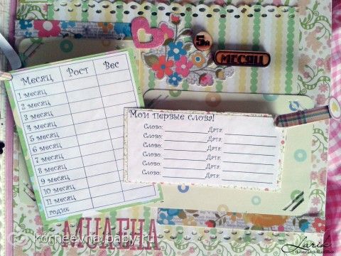 (пятый месяц с секретиком: вложены таблички роста-веса + первые слова)