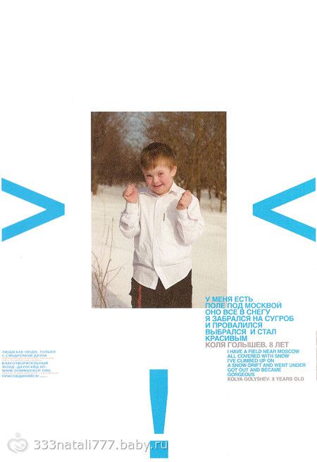 «Здравствуйте все… С Вашего позволения хочу написать здесь кое-какие свои мысли, т.к. темы именно для отзывов я на сайте не нашёл… Меня зовут Михаил и я учусь в Новосибирском государственном педагогическом университете… Сегодня,17-го февраля, я долго стоял у стенда с фотографиями работ, посвящённых синдрому Дауна… В нашем универ-те проходит данная выставка и она имеет некоторый ажиотаж! Приходится видеть много молодых девушек и парней, которые смотрят на фотографии и думают о чём-то своём… Скорее всего связанное со своими переживаниями по данной теме! Я простоял минут 40 и не мог отойти… Меня переполняют чувства и сразу же, записав адрес этого сайта, я решил написать о них здесь! Во-первых, хочу выразить огромную благодарность тем, кто организовал такую выставку вообще и именно в нашем ВУЗе, хотя даже не знаю, как зовут данных людей.Вы действительно молодцы, Вы делаете социально значимое дело! Вы даёте пищу для размышлений и возможность понять, что стоит пересмотреть свой взгляд по данной проблеме… Какой?! Проблеме отношения общества, нашего общества… Во-вторых сказать самые тёплые слова в адрес тех родителей, которые посмотрели своему ребёнку в глаза и сказали „Я тебя люблю!“… Если в сердце есть хоть капелька доброты и любви, то может наш мир ещё можно сделать краше и ярче! Ну и в-третьих, хочется сказать всем детям, которые имеют синдром, что вы просто умнички!!!Смотря на вас, хочется улыбаться всегда, улыбаться доброй и приветливой улыбкой! А как иначе?! ))) От волнения забыл половину всего того, что хотел написать… Но кое-что высказал!»
