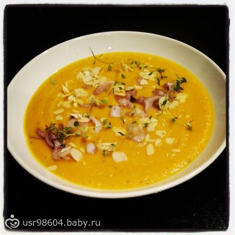Украсить креветками/морепродуктами и семечками тыквы/лепестками миндаля.