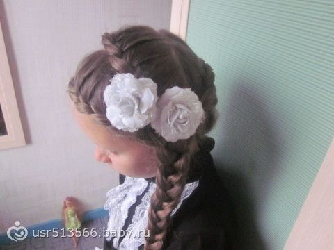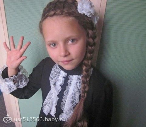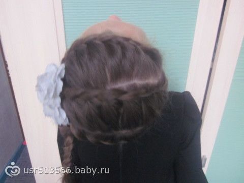 Нам в 2,5 года пришлось полностью сбрить волосы, когда готовили к операции, поэтому сейчас волосы еще не очень длинные по плечи, я выдумываю прически еще чтобы не было видно шрама от операции, прямой пробор не сделаешь, видно шовчик, делаю или косой или подобным образом выкручиваюсь