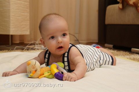 Из того, что мы умеем: Тимоша переворачивается, уверенно описается на ладошки, привстает на руках, хорошо подтягивает голову, тянется за ручки… хочет сесть...
