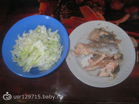 Обед — вареная рыба, салат из свежей капусты с растит, маслом (рыбу я съесть не смогла, встала она у меня поперек глотки, в прошлый вечер видать ее объелась)