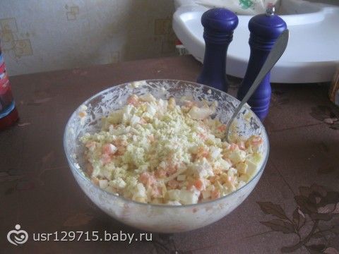 рецепт 1/2 банка кукурузы, 100 г твердого сыра, 3 яйца, 1 большая вареная морковь, 300 г колбасного сыра, 1 головка лука, 100 г майонеза, перец, соль
