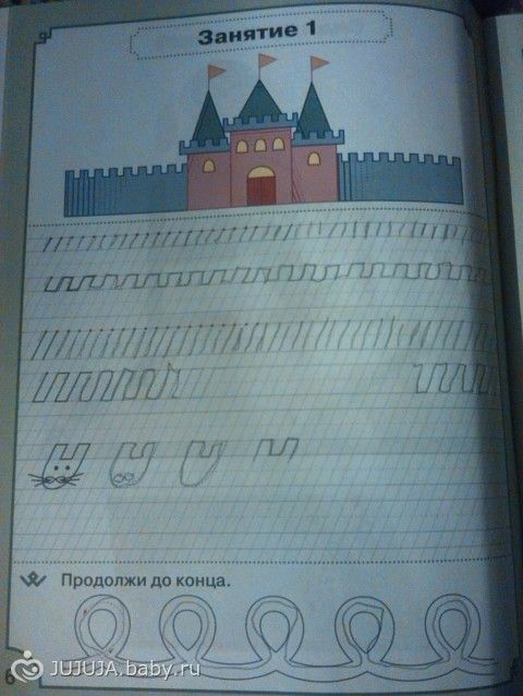 Дома надо дорисовать до конца. Хочу задать вопрос ребенку по последнему заданию, почему он именно так «продолжал» рисовать петельки))). Решила купить ему пропись, чтобы и дома тренировался, но только если захочет, навязывать не буду.