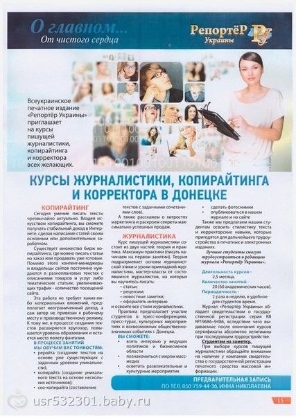 РЕДАКЦИЯ ВСЕУКРАИНСКОГО РЕКЛАМНО ИНФОРМАЦИОННОГО ИЗДАНИЯ «РЕПОРТЕР УКРАИНЫ» ОБЪЯВЛЯЕТ НАБОР НА КУРСЫ ЖУРНАЛИСТИКИ, КОПИРАЙТИНГА И КОРРЕКТОРА В ДОНЕЦКЕ!!!