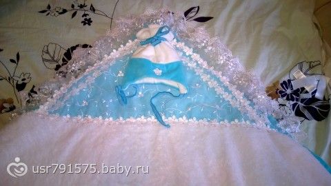Вариант 1.Купили одеяло (овечья шерсть), фоткать не стала, там всё банально.К нему белый пододеяльник (дороже чем само одеяло!!!)ну и голубая ленточка.Тогда под него что? В 2 пеленки или можно бодик тоненький, а сверху теплый велюровый??? Но мне кажется холодно будет(рожать в первых числах декабря).Есть еще байковое одеяло.