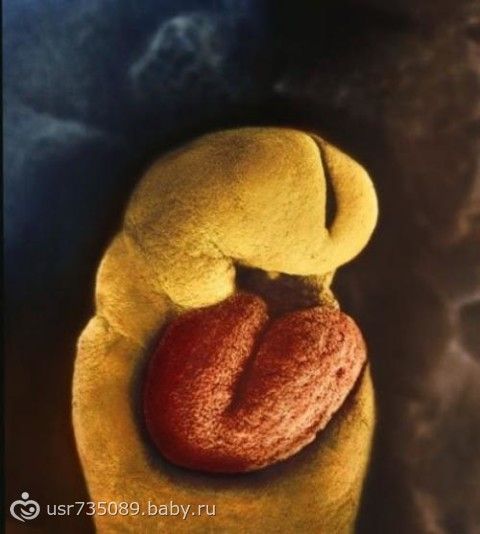 24 дня. Скелета у месячного зародыша еще нет — есть только сердце, оно начинает пульсировать на 18-й день