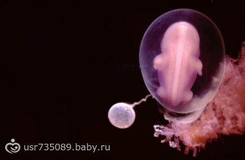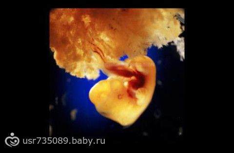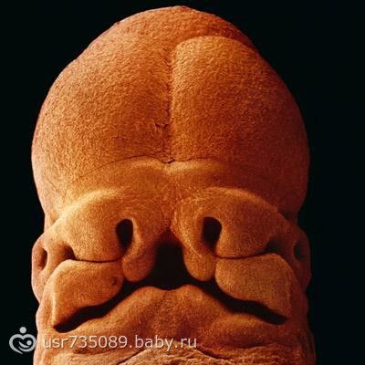 Пятинедельный эмбрион, длина 9 мм, уже угадывается лицо с отверстиями для рта, ноздрей и глаз
