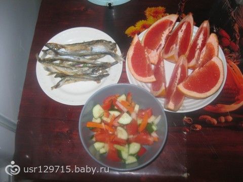Ужин — такой вкусный и сытный) жареная мойва, овощной салат, 1 грейпфрут