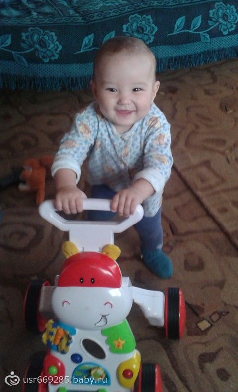 Мы ползаем, ходим у опоры и за ходунками, которые нужно катать. У Артёма один зубик. Любит сынок играть машинками, танцевать и подпевать папе, когда он играет на гитаре.