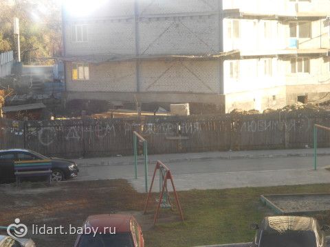 иду смотрю, спросонья вглядываюсь в наш шикарный двор, авось машина с бантиком стоит скромно у подъезда))) ничего… говорю, издеваешься, да? а он мне — ну и фиг с тобой, не видишь и не видишь… Потом приглядываюсь, а напротив на заборе поздравление...