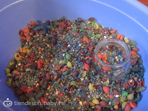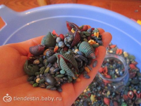 Я взяла 3 пачки перловки (все берут рис почему-то, но перловка-то дешевле!), макароны в виде ракушек, порылась на кухне в крупах и достала оттуда все, что нашла: фасоль (смесь цветов), соевые бобы, маш, черный рис, красную чечевицу, кускус, еще какую-то хрень, в общем, все что найдете в своей бакалее можно смело пускать в ход. Цветные крупы можно закидывать в тазик сразу, а перловку и макароны покрасить. Я долго искала хитросделанный рецепт со спиртом, а потом забила. Взяла обычную гуашь (у нас елц в бутылях), и смешала на глаз с крупами и макаронами, в разных контейнерах, разумеется. Чуть-чуть воды плеснув, да. Оставила все это высыхать через часов 8 достала, разрыхлила и туда же — в тазик! Добавила стеклянных шариков, какуюто околоморскую лабуду и все! Эмик сам таскает туда баночки и ложечк, чтоб играть)))