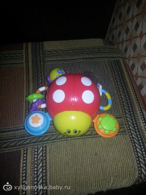 Пирамидка, обычная из круглых разноцветных бубликов. Неваляшка. Сортер очень нравится (когда внутри гремят фигурки). Купила дубинку со свистком. Очень нравятся мягкие игрушки, прям обнимает кусает и смеется, а если они еще и поют то ваще ржака. Книжки нравятся. Ну и резиновые игрушки для купания любим кусать. Вообще я игрушки почти не покупаю, у нас всего лишь корзинка под стульчиком для кормления… но мы ежедневно стоим и ковыряем эту корзинку или толкаем стул по комнате — учимся так ходить. Самая занимательное это пустые бутылки от чая липтон и пластмассовые вешалки)))