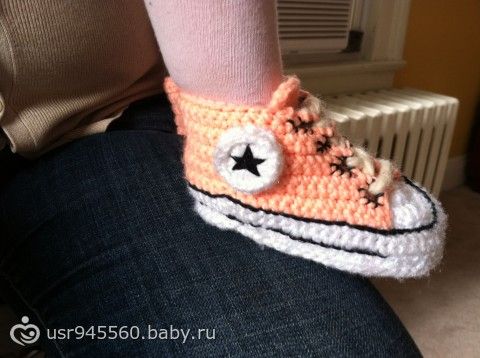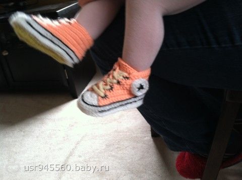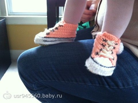 А недавно выдалась куча выходных, так я связала шапочки для обеих девченок и пинетки для младшей. Как раз кто-то недавно писал про пинетки-кеды и мне ну очень сильно захотелось такие связть. Вообще это первые в моей жизни пинетки)))