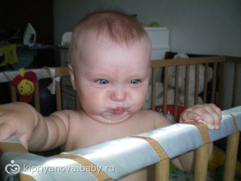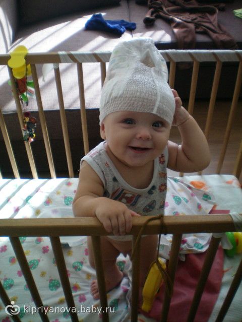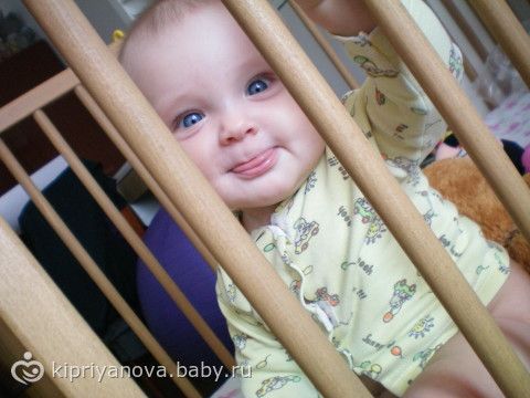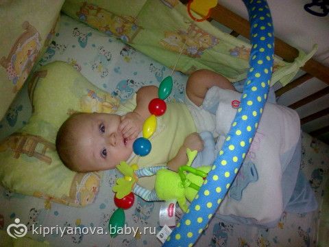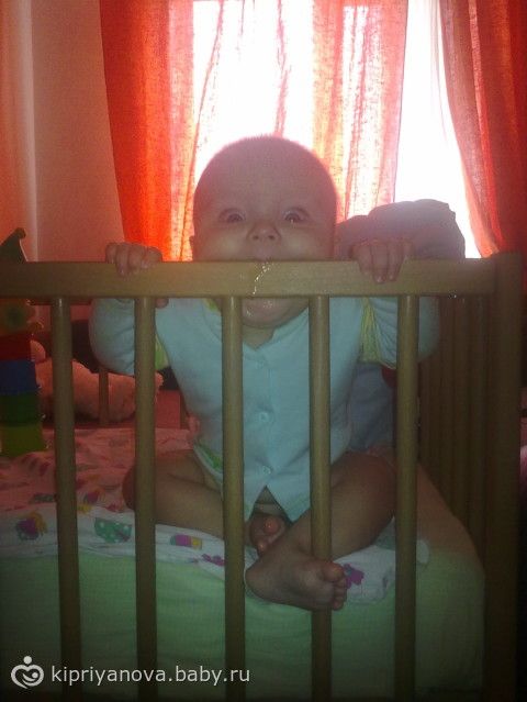 Малыш довольный сидит в кроватке ковыряется с первыми подарками от бабушки)))