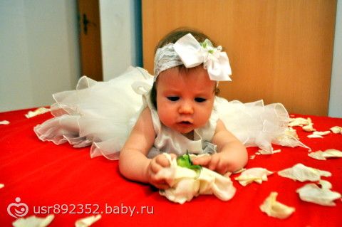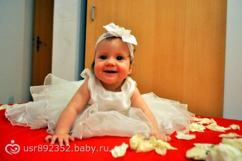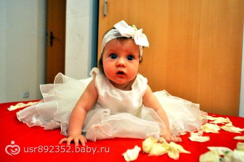 Вот такая уже большая))) в 5 мес 3 нед, прорезался первый зубик))) теперь кусается еще больней))), строит смешные рожицы, повторяя за нами. Такая сознательная))) ползает во всю, кувыркается, садится, пару раз сама на ножки вставала, держась за диван))). А еще обниматься начала, прижимаясь так крепко-крепко, и стесняется вовсю. хохочет, лопочет, активно требует к себе постоянного внимания-настоящая принцесска)))). Безумно ей понравилась собака, так заливается при виде Ральфа, а вот к кошкам совершенно равнодушна).