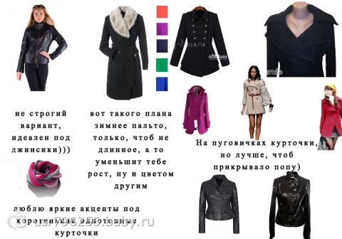 А на счёт верхней одежды, то я предпочитаю пальто, курточки кожанные (под кожу) на пуговица приталенные (под платица, юбочки, джинсы, брюки, штаны), или на молнии (более спортивный вариант, который предпочитаю только под джинсы). Советую пальто под твой рост брать недлинное и не чёрное, поэкспереминтируй с цветами (я в фото ставила цвета, которые думаю тебе подойдут к лицу)Трошкидлинный коммент вышел