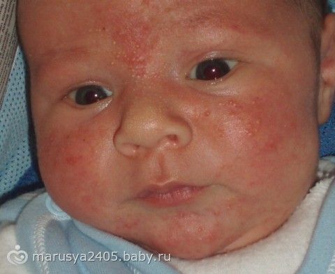 и прыщики безцветные и красные на щечках, на головке, по телу в некоторых местах, места меняются, то сходят в одном появляются в др. не большие маленькие прыщики. за ушками сухая корка, на щечках сухость