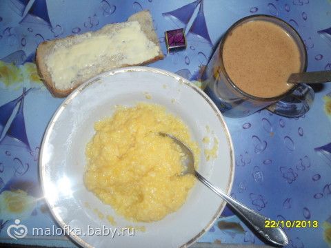 Завтрак: кукурузная кашка с медом, кофе с молоком и корицей, долька горького шоколада и кусочек хлеба с маслом