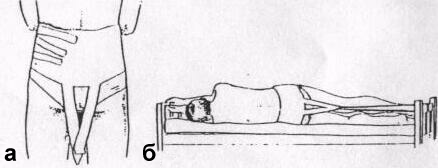 Упражнение 25. Более эффективен способ растяжения позвоночника с помощью специального самодельного приспособления (рис. 131, а). Прочный шнур с одной стороны цепляется к особому креплению на задней стороне корсета, с другой — к спинке кровати. Исходное положение: лежа на спине, животе или боку (в зависимости от того, какое положение наименее болезненно), корсет затянут. Ноги вытянуты в сторону спинки кровати, где привязан шнур. Взяться руками за спинку кровати и подтянуться так, чтобы шнур натянулся (рис. 131, б).