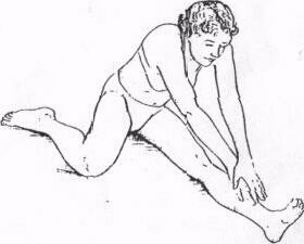 Наклониться вперед к вытянутой ноге, стараясь достать стену руками (рис. 132). Если это упражнение делать достаточно энергично, можно почувствовать, как “тянутся” мышцы на задней стороне бедра вытянутой ноги, прикрепляющиеся к костям таза. Повторить 10 раз.
