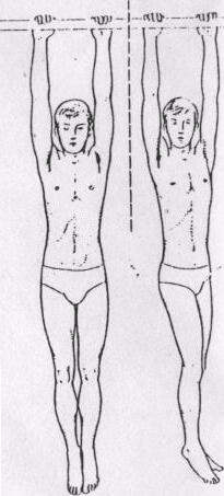 В этом положении, в отличие от провисания на руках, очень легко контролировать прилагаемое усилие: чем оно значительнее, тем значительнее эффект растяжения. При появлении болей или неприятных ощущений достаточно разжать руки, чтобы прекратить воздействие. Кроме того, расслабиться в этой позе гораздо удобнее и легче, чем в положении «провиса» на руках. Прилагаемое усилие должно быть не больше того, чтобы почувствовать натяжение в спине. Продолжительность упражнения 15–30 с, отдыха 30–60 с. Общее время тренировки (потягивание–отдых) 15–20 минут (или пока боли существенно не уменьшатся).