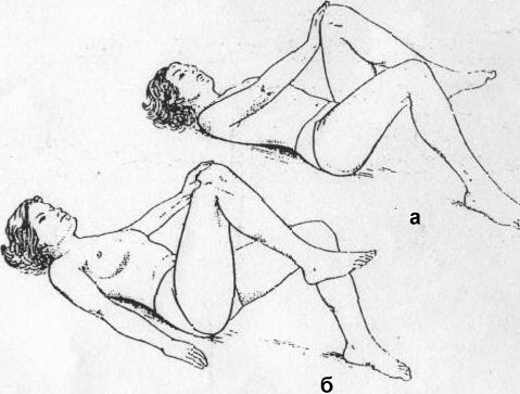 Если выполнять упражнение в приведенном варианте трудно, можно облегчить его: перекладывать ноги в стороны, не отрывая лопаток от пола и не поворачивая головы и верхней части туловища в противоположную сторону (рис. 126, в). Для тренировки гибкости позвоночника этого вполне достаточно.