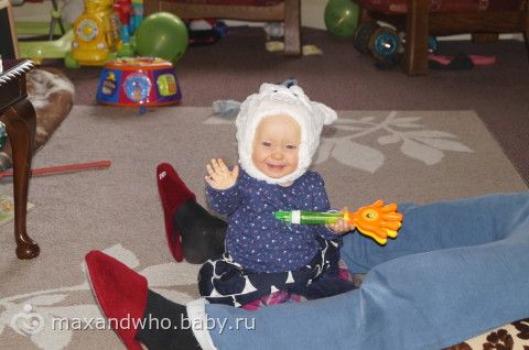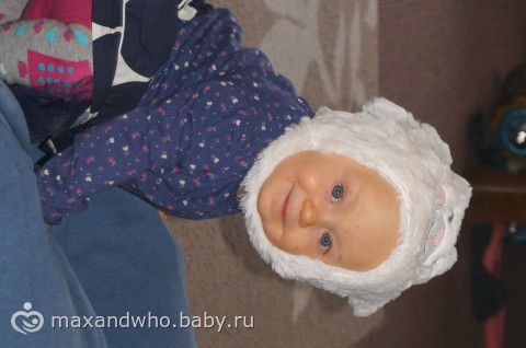 Работал наш папа сегодня в другом городе. Хоть и столько же часов дома отсутствовал, но считается раз далеко значит они с дочей сильнее соскучились друг по другу!!! (маразм правда?) типо он говорит, что сердцем чувствует расстояние! а значит она тоже.:))) а за такие душевны е страдания доче положен подарок! (ну чтоб скрасить расставание с папкой) Привез он ей шапочкузайку с рукавичками. Напялил, а она довольная шапки то любит:)))