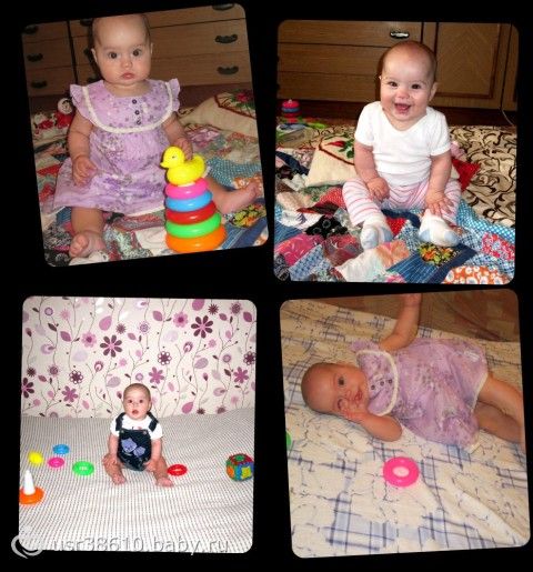 мы уже хорошо сидим, ползаем на животе и становится на четвереньки раскачивается в зад перед))держась за быльце кроватки становится на четвиреньки и выглядывает! любит болтать, говорит слоги (бууууууууу, бабаба, ма, дадада, гагага и т.д)! Очень любит кушать! правда еще не взвешивались! Во сне крутится как взрослая) то на боках то на животе спит! Рита у меня гиперактивный ребенок! Днем спим мало, все в движении, везде лезет, все ей интересно! Но ночью спим хорошо! зубов у нас пока что нет(