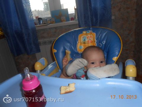 Муж вечерком к нам ещё заехал и привёз нам всё, что я его просила.Стульчик для кормления, бортик на кроватку, а то кровать железная всю голову себе отобьёт и много ещё чего.