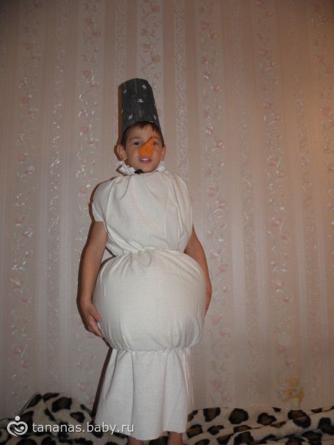 все из поролона 3 см толщиной. свернула в трубы разные по диаметру, ножницами вырезала клинышки чтоб придать округлую форму, сшила нитками. в верхнем шарике вырезала дырки для рук… одевался через голову...