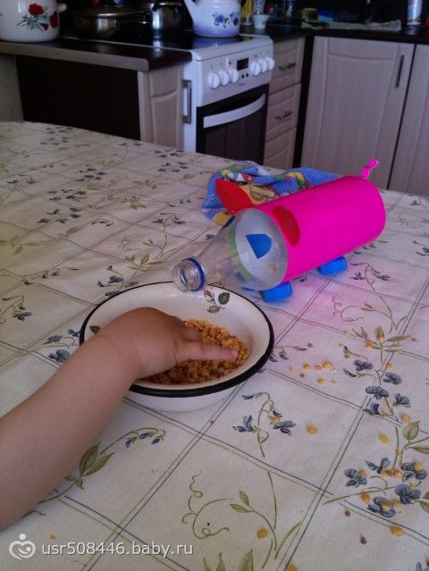 дочь уже 25 минут сидит и играет с макарошками-спиральками разноцветными) тишь да благодать… а самое главное, она их не ест! (пробовала орехи, чищеные правда — ела, мелкие конфетки в фантиках — тоже в рот сует, катушки нитог давала — так потом один большой клубок получается :-) ).