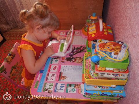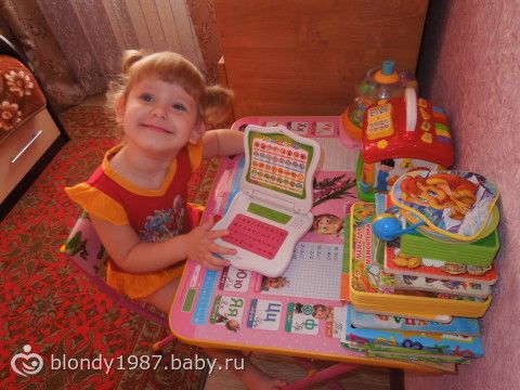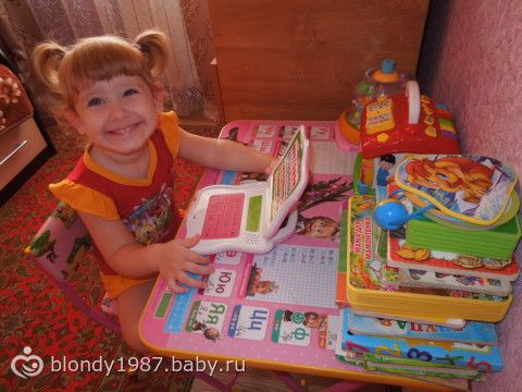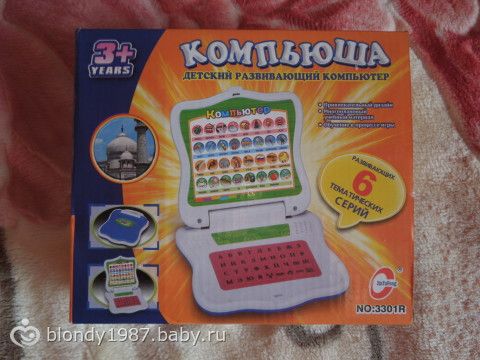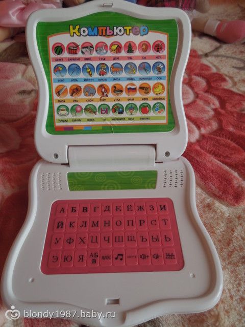 Вчера нам было 2 годика и 4 месяца!!! мы уже совсем большие!!! И вот бабуля(моя мама) подарила доче вот такую штуку-развивающий компьютер!!! Я давно хотела такой доче, но как-то посмотрю на них-они более уже для деток постарше.А этот как раз для такого возраста деток, хоть и написано от 3х лет.Доча от него в восторге, нажимает на кнопочки, повторяет буквы, слова и танцует под музыку! Вот такой подарок от бабушки! Ну и немного фото)