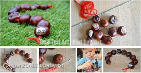 Поделки из каштанов – пожалуй, самые осенние. А змейку из конских каштанов и вовсе можно считать классической осенней поделкой. Для создания этой игрушки потребуется: десяток каштанов, шило или тонкий шампур, небольшой отрезок жесткой проволоки, прочная пряжа яркого цвета, пластиковые глазки-самоклейки. Сначала разложите каштаны по размеру от большего к меньшему. Самый большой каштанчик станет головой змеи. Затем проткните каждый каштан насквозь шилом или шампуром. Отрезок проволоки согните пополам и проденьте в «ушко» получившейся иголки нитку пряжи. Теперь ребенок сможет самостоятельно нанизать каштаны на нить. Надевая каждый следующий каштан, можно завязывать на нитке узелок вплотную к кожуре, но это не обязательно. После того, как все каштаны окажутся на нитке, завяжите с обеих сторон змейки толстые узлы и обрежьте лишнюю пряжу. Со стороны головы оставьте небольшой раздвоенный язычок. Приклейте глаза. Змейка готова!