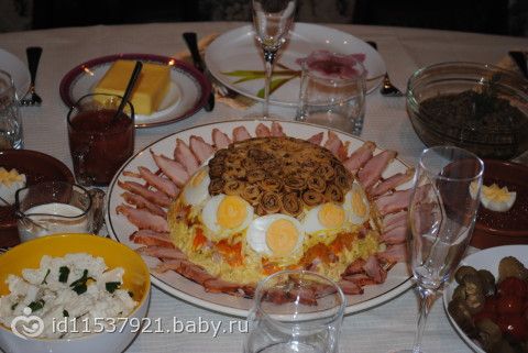 В середину выложить колбасу с зеленым горошком.затем морковь и огурцы.