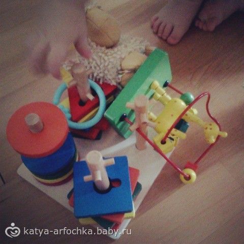 у него получается доставать, но не все. Надевать получается не на нужные места та, что я потом снять не могу)))) реально, не представляю, как можно просунуть детальку с 2 дырками туда, где 3 дырки))) купи самые простые рамки(круг, квадрат вставлять), такую штуку типа пирамидки, но деревянную, чтобы нанизывать фигуры.