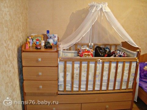 А я вот чего то не стала передний борт вешать, чтобы видно его было первое время… и на комод этот то составлю все, то уберу… пылиться… =) У нас кровать на подобие…