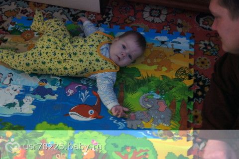 Тоже на животе спите? Ксюша у нас сейчас только на животе и спит. У нас коврик-пазлы очень похожий, только там пейзаж нарисован и отдельно животных (идут в комплекте) на коврике можно расставлять.