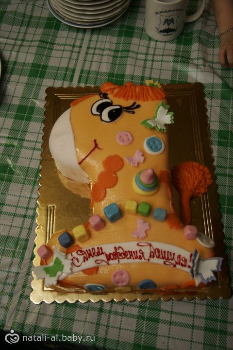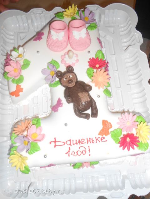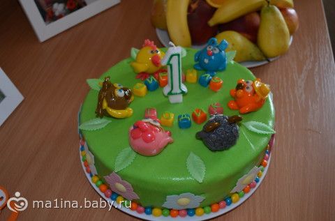 Вот такой тортик у нас был на годик.Всё своими руками.Зверат из чего делала???