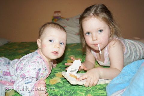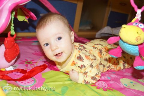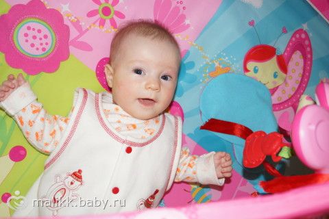 Нам уже 4,5 весим по-прежнему маловато 5100 и 61 см, умеем переворачиваться в обе стороны, улыбаемся и смеемся уже на фото видно не случайную, а такую осознанную улыбку)) кушаем только титю, смесь пока не даю, так как молочка стало больше, скоро начнем яблочную пюрешку вводить. Еще мы начали различать своих и чужих, и начала пугаться бабушек, дедушек и других родственников, надеюсь привыкнет по-тихоньку к ним и не будет так их бояться, еще наши девочки начинают вместе играть, старшая показывает младшей книжки, рассказывает что там нарисовано, «читает» стихи, по памяти конечно, вообщем растем развиваемся и все у нас хорошо)))