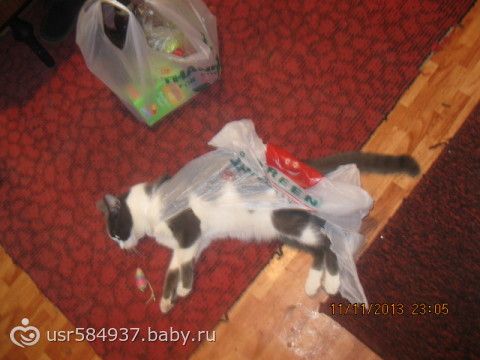 Вчера ушли с мужем в магазин вечером, нас не было минут 10 от силы… Мой чудо кот залез в пакет порвал его и это выглядело вот так!!!