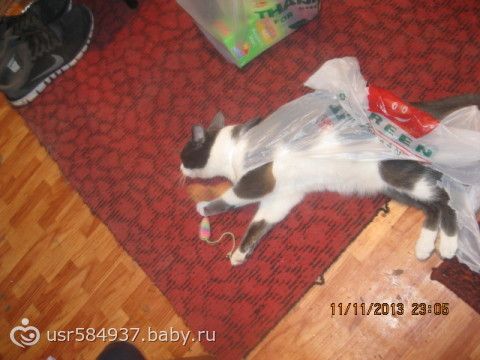 ему нравилось в пакете, а потом видать он его достал кот его порвал!!!
