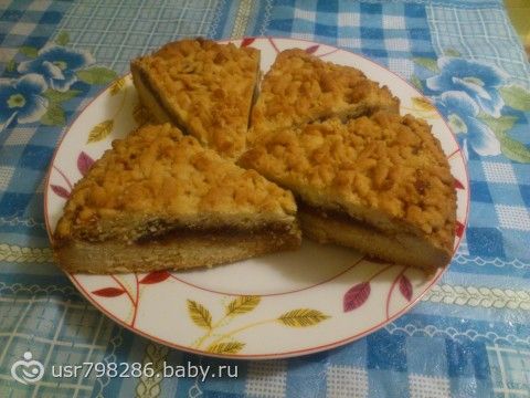 Все ингредиенты соединяем, перемешиваем тщательно (я без миксера, собственными ручками всё замешивала))Если вы добавляете сливочное масло или маргарин, то его нужно растопить и остудить. Муку добавляем постепенно — частями, соду в последнюю очередь.Замешиваем тесто, должно получится не сильно крутое, но в тоже время чтобы отлипало от рук.Пусть оно немного полежит при комнатной температуре 10-15 мин, затем делим его на две части.Одна должна быть больше, другая меньше — её мы и кладём в морозилку на час, чтобы затвердело. Большую часть теста выкладываем на противень или в форму для запекания (кто в чём готовит) и равномерно распределяем по всей поверхности, при этом слегка углубляем в середине, чтобы можно было туда положить варенье и чтобы оно не вытекало с краёв.Сверху трём на крупной тёрке часть теста, которая лежала в холодильнике.Ставим в духовку на 40 мин при t 185-190.Достаём и наслаждаемся)))Приятного аппетита!)) Мой муж лично в восторге!!